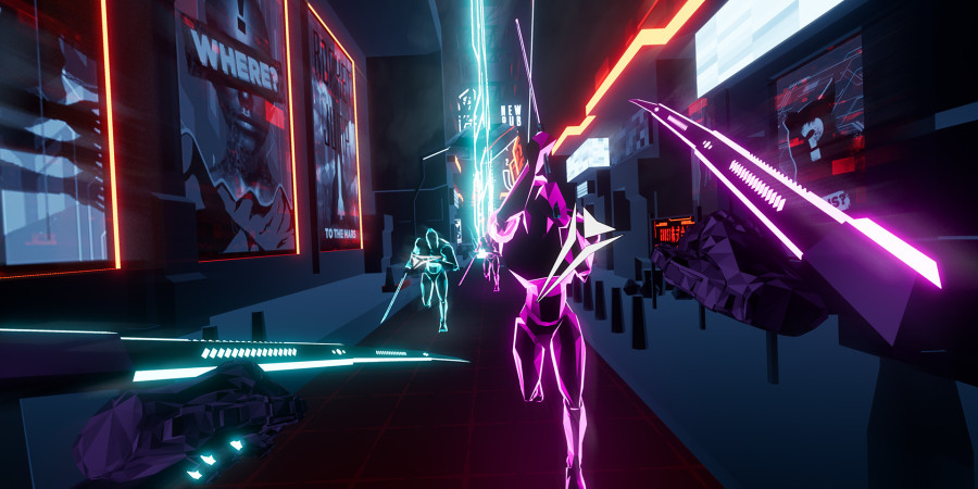 Developed by Tom Reason and published by Shada Games, Cybrid blends swordplay and gunplay in a high-energy combat experience. Players battle through a glowing cyberpunk city, using reflexes and rhythm to dash, jump, deflect, and strike down waves of cyborg enemies — all synced to dynamic music tracks.